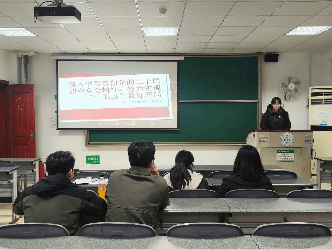 为学习贯彻党的二十届四中全会精神,切实把思想和行动统一到“十五五”规划战略部署上来,努力实现“十五五”良好开局,3月24日,会计专硕研究生第一、第二党支部联合开展组织生活会,全体党员参会。