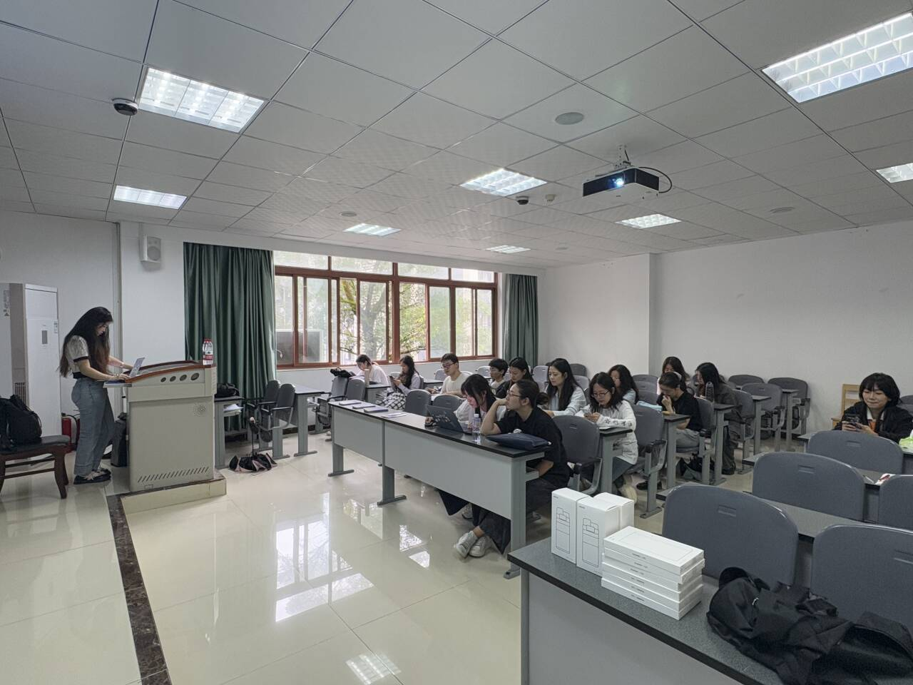 朱经理以简练精彩的语言展开宣讲,内容涵盖旗舰新品迭代、智能生活馆至授权体验店和运营商专区在内的四级零售矩阵,以及“1+N”人才成长通道。宣讲案例鲜活、信息紧凑。在问答环节,同学们积极踊跃提问,就晋升路径、薪酬福利、异地调配等关心的问题与企业互动交流,企业方也准备了多份礼品作为互动回馈,现场气氛热烈。