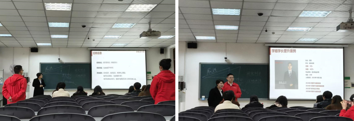 同一时间,就职于鸡毛店公司的谭勇学长现场讲解自己在企业中的晋升之路。并且回答了同学们关于如何做好工作和学习平衡的问题。最后高女士再次说明了招聘人才的要求和原因,以及职位给同学们提供的有利条件,让毕业生和企业在此次专场招聘实现了双向奔赴。