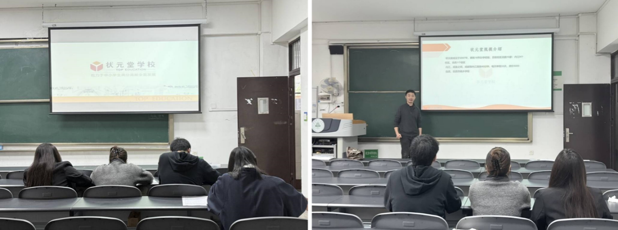 状元堂张老师就教学和教研理念、上课方式、师资教研团队、校区活动、招聘岗位及薪资福利等方面进行了简要说明。心田花开张老师则介绍了教培行业、公司情况、品牌特色、岗位需求、培养方案及福利待遇等内容。鸡毛店公司高女士就企业基本情况、人才培养方案、薪资、晋升通道、员工待遇以及学长学姐的晋升案例等方面进行了简要说明。