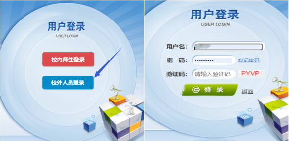 用户名:26+考研报名号(学校初试成绩查询中可查报名号<点击查询>,默认密码:身份证号码后6位。点击校外人员登录