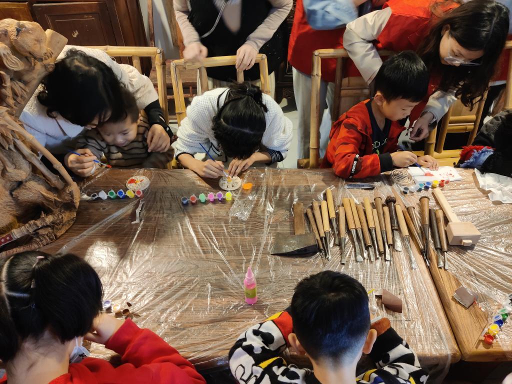 5月14日上午,我院青年志愿者来到成都市都江堰市民俗陈列馆协助社区开展木雕公益课堂,灌县木雕传承人何飞担任本次课堂的主讲人,十余名小朋友参与其中。