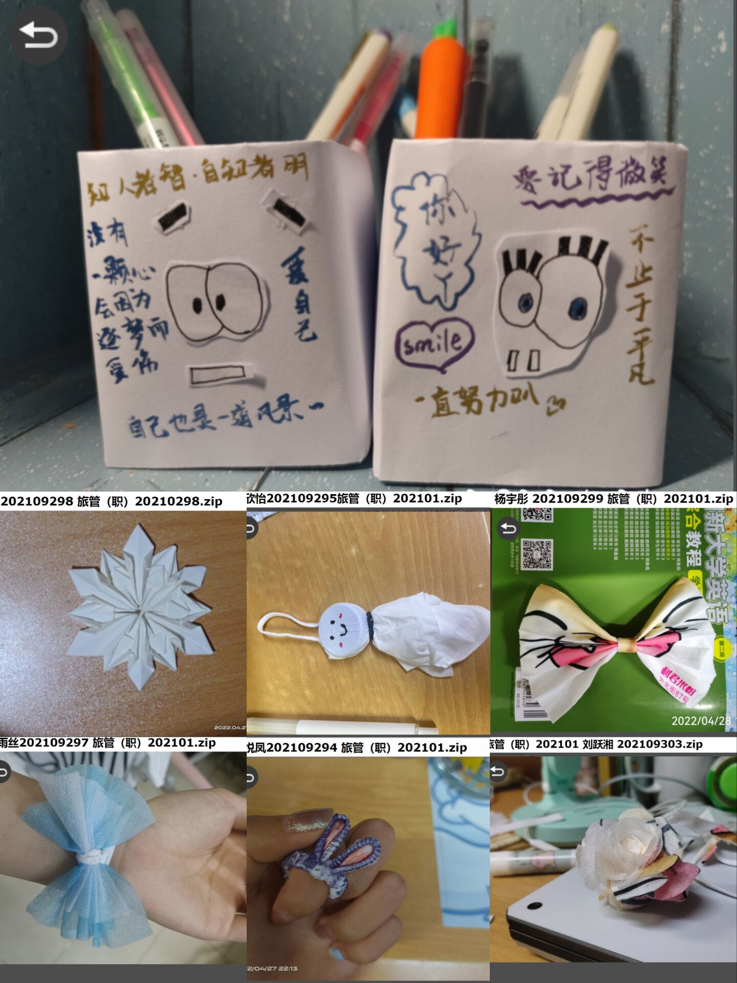 同学们的作品各具特色,有家中毛线织出的棋盘格挎包、废旧易拉罐和吸管做出的烟灰缸、瓶盖和纸巾做出的幽灵挂件等。受疫情影响,以口罩为元素制成的蝴蝶结、头绳等小物件占旧物拼装的40%。