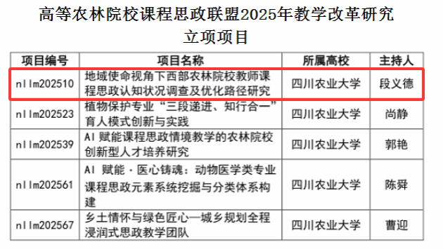 近日,从全国高等农林院校课程思政联盟传来喜讯,我院评估与审计系教师段义德副教授,获联盟首批“课程思政”专项教改项目立项。作为我校本次获批立项的5项项目之一,该成果标志着我院在课程思政建设领域的探索与实践获得全国高等农林院校的认可,也是我院“党建+”校级“双带头人”教师党支部书记工作室培育创建的重要成果。